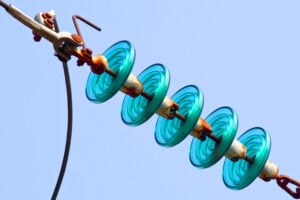 Blue glass insulators rest along a power line.