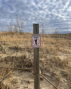 A modern “Save the Dunes” sign seen on a post, along with rope blocking foot-traffic, which causes dune erosion.