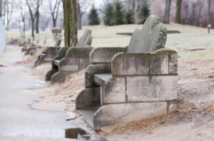 WPA era limestone benches photographed still standing in modern day Washington Park.